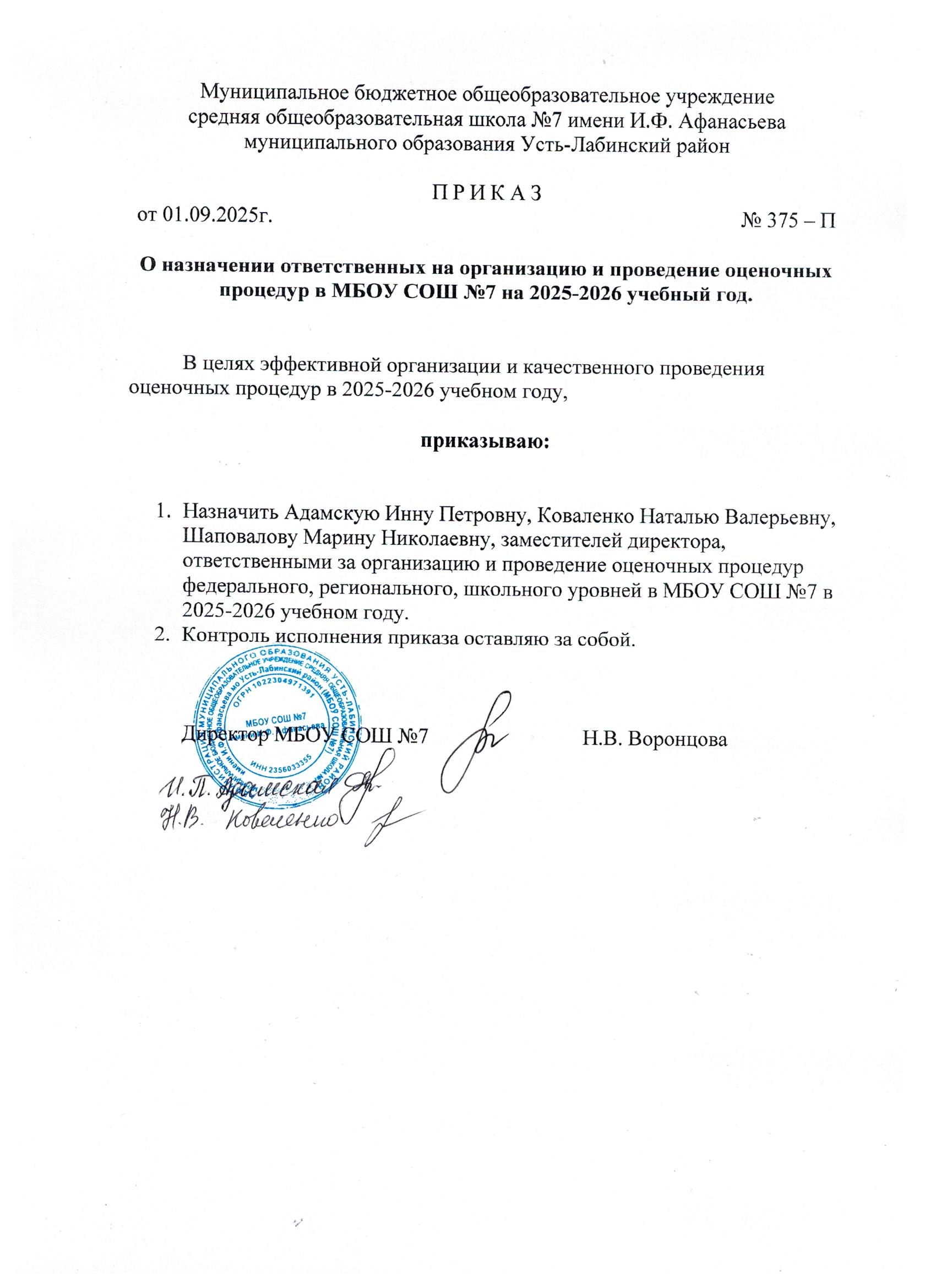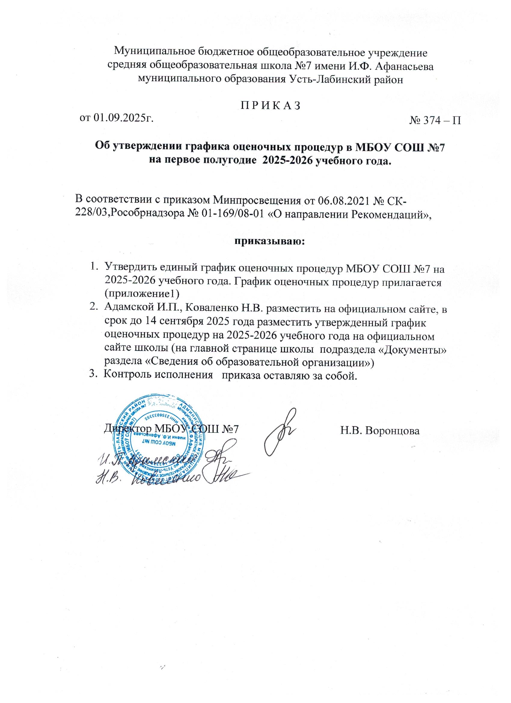График оценочных процедур в МБОУ СОШ № 7 им. И.Ф. Афанасьева на 2025-2026 учебного года