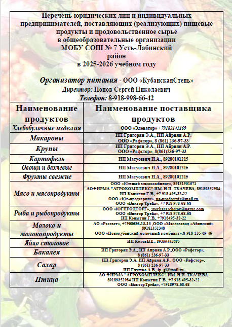 Перечень юридических лиц и индивидуальных предпринимателей, оказывающих услуги по организации питания в МБОУ СОШ №7