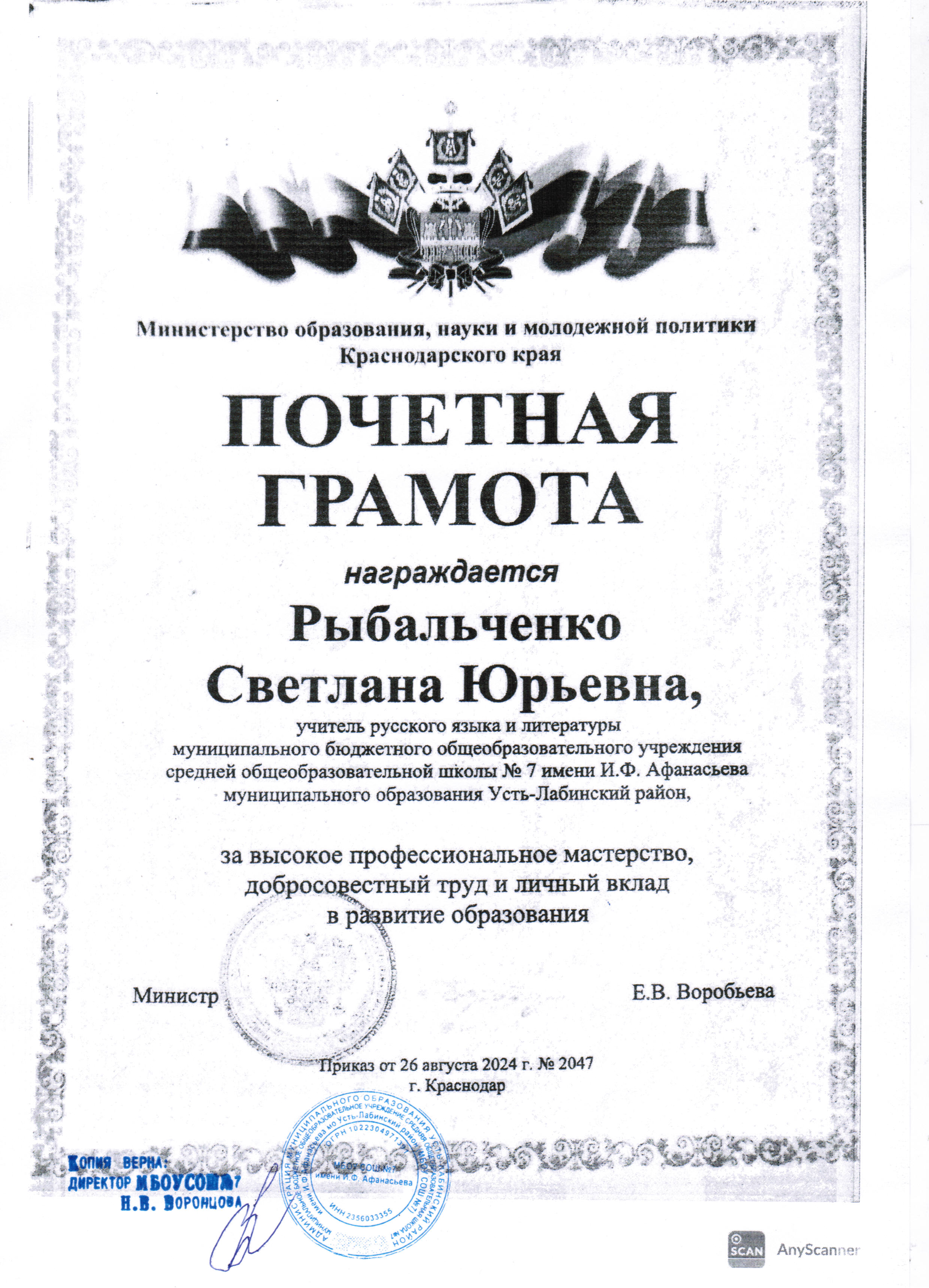 Почетная грамота МОНиМП Краснодарского края, 2024 г.